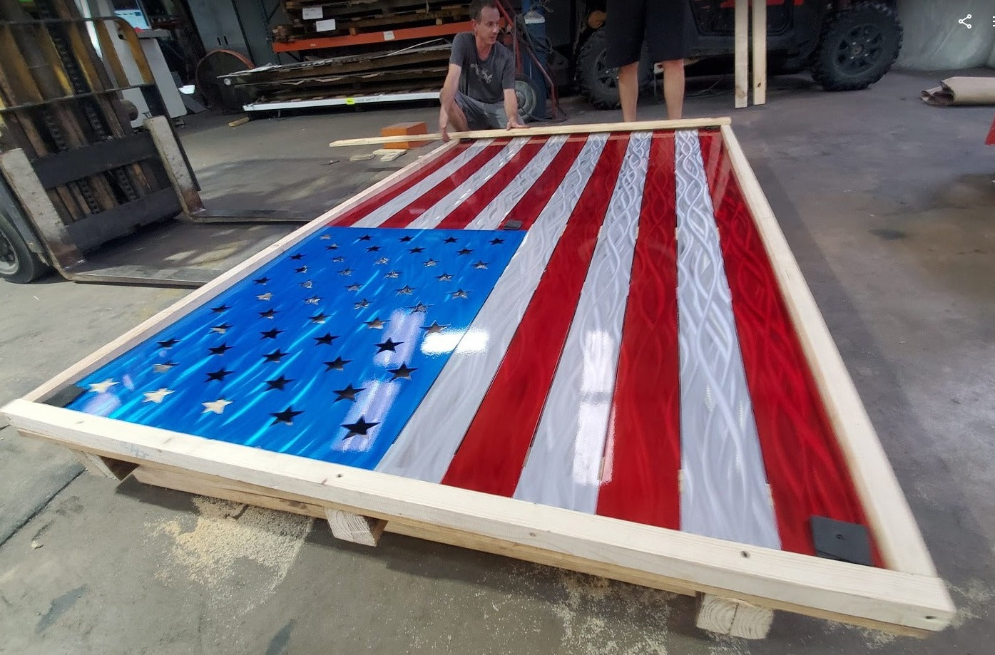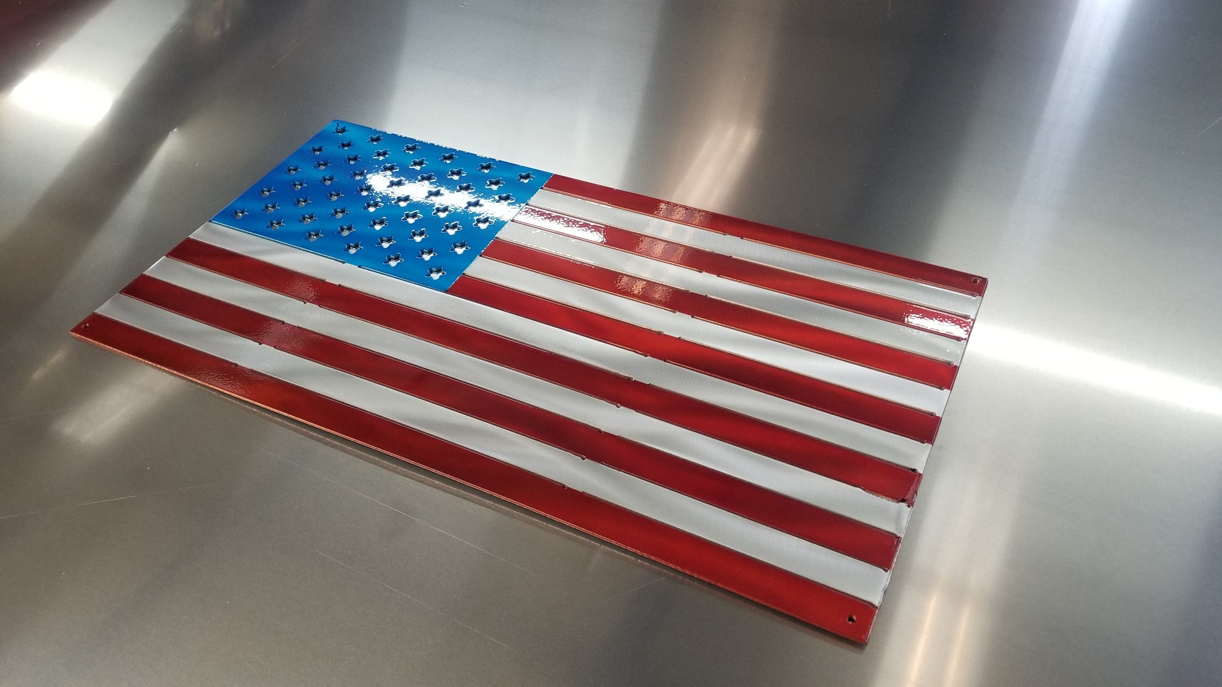 Made from high quality aluminum to resist rusting. Laser cut and ground to look like a standard flag.  Please be aware that these are custom cut and ground to order and the look of them (including color) may vary from piece to piece. We can make any size depending on your budget. The one pictured is 24" and is painted with high quality candy paint and then triple clear coated. Please click dimensions for pricing. Contact us for larger versions than what are listed.