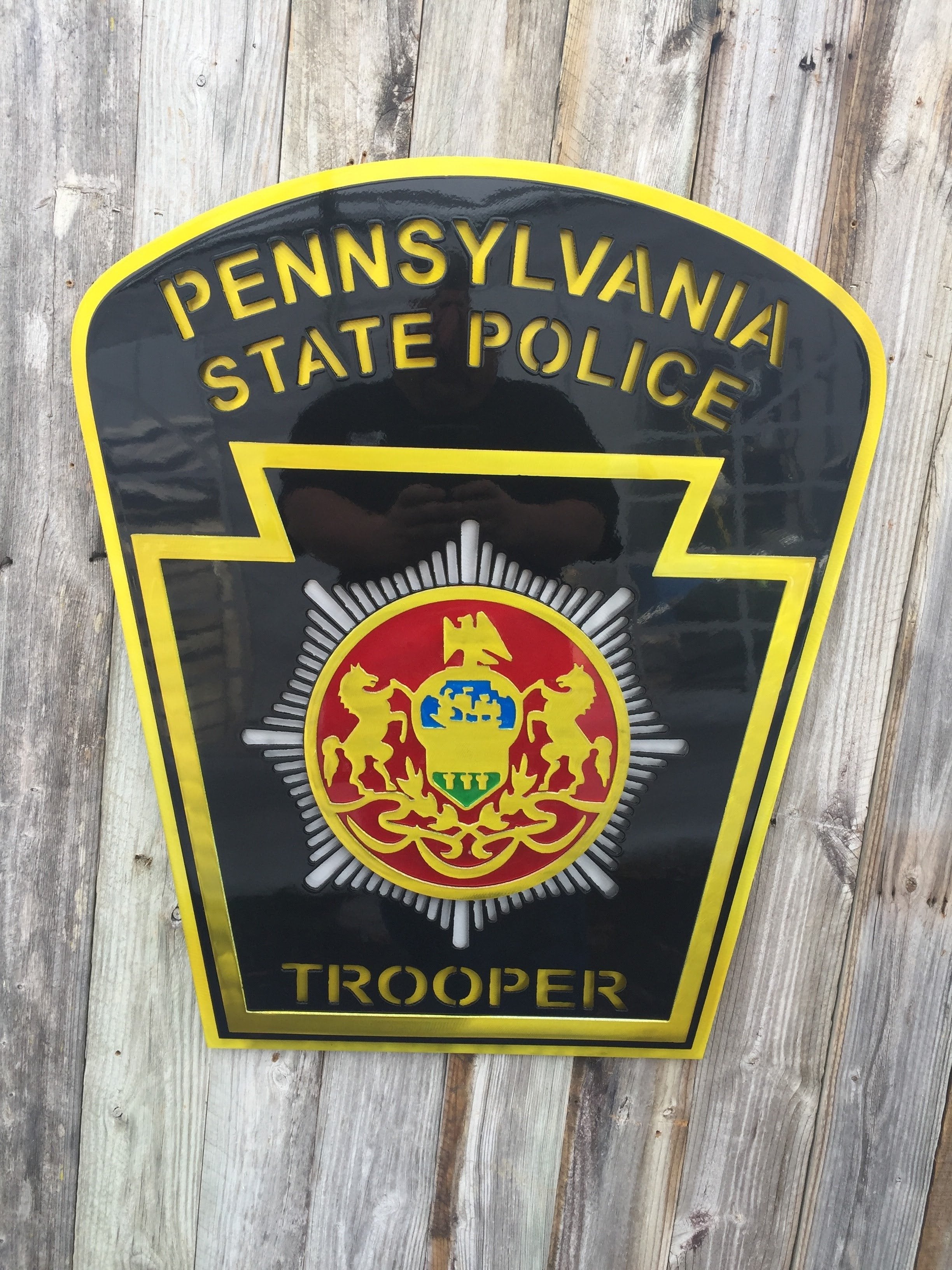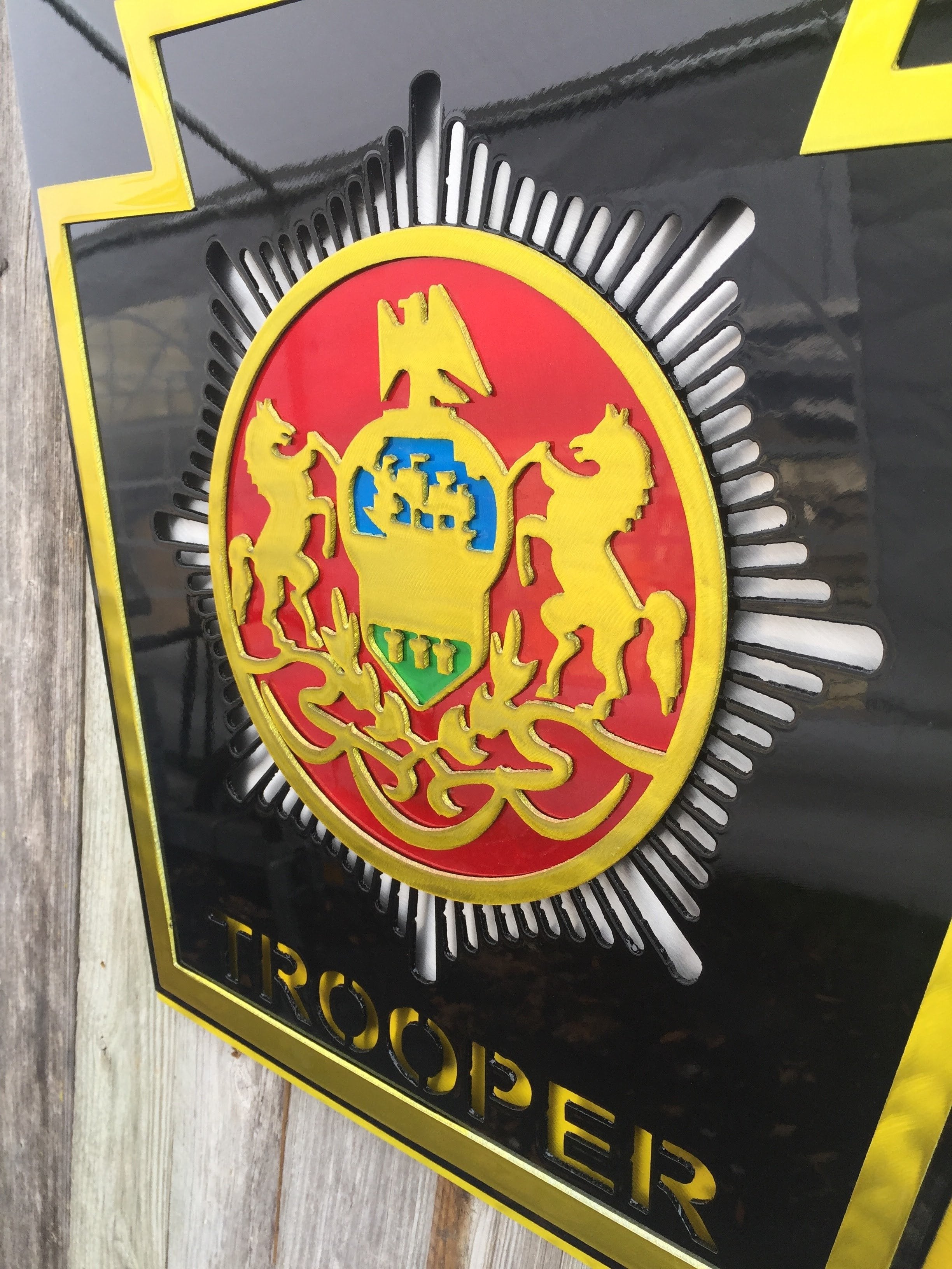 Pennsylvania state trooper badge made of metal. 3 layered and painted to look like the real badge. This item is fairly large at 24"es tall.