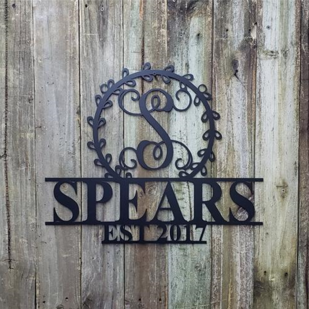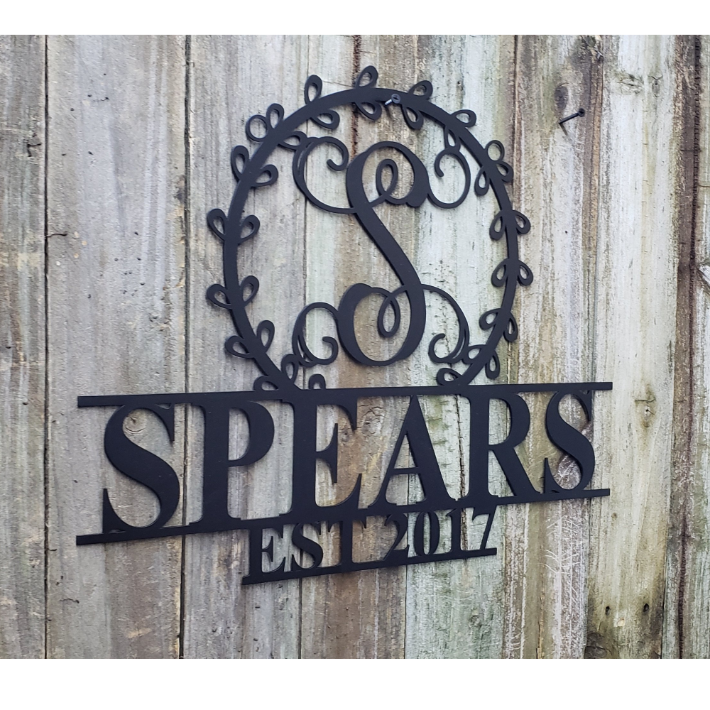 Round Frilly Monogram with Name and Established Date - Personalized Custom Metal Art Home Decor.