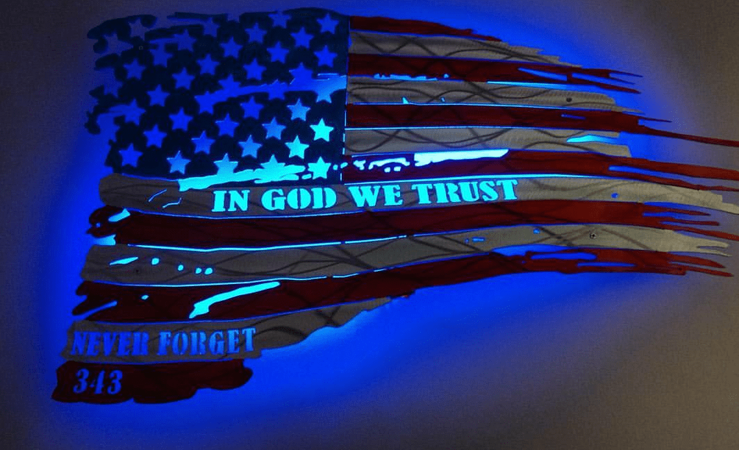 Tattered and Torn American flag made from aluminum. Laser cut and ground to look like a tattered and Torn flag. Made from high quality aluminum to resist rusting. Please be aware that these are custom cut and ground to order and the look of them (including color) may vary from piece to piece. We can make any size depending on your budget. The one pictured is 24" and is painted with high quality candy paint and then triple clear coated with strong Automotive clear. Please click dimensions for pricing. Contact us for larger versions than what are listed.